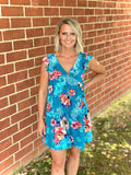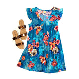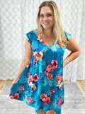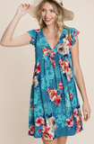Stand out in style with our must-have floral dress in turquoise. This easy to style swing dress is perfect for warm-weather dressing. Throw on a floppy hat for a boho chic look. Flutter sleeves add a feminine touch.