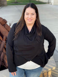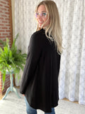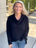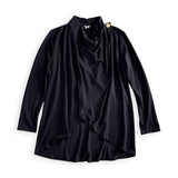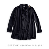 Tell a love story every time you wear this stunning solid black cardigan. This coverup provides true versatility. Wear draped and buttoned on the shoulder for a snuggled up look or with an open front for a traditional cardigan style.